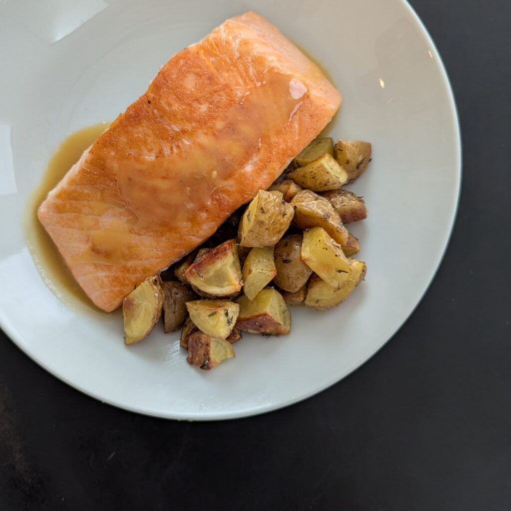 With three simple ingredients, it’s easy to throw together a quick dinner with elevated flavor. This maple dijon sauce over grilled salmon and rosemary potatoes, is a family favorite. It’s sweet and savory, with a fresh kick of ginger.